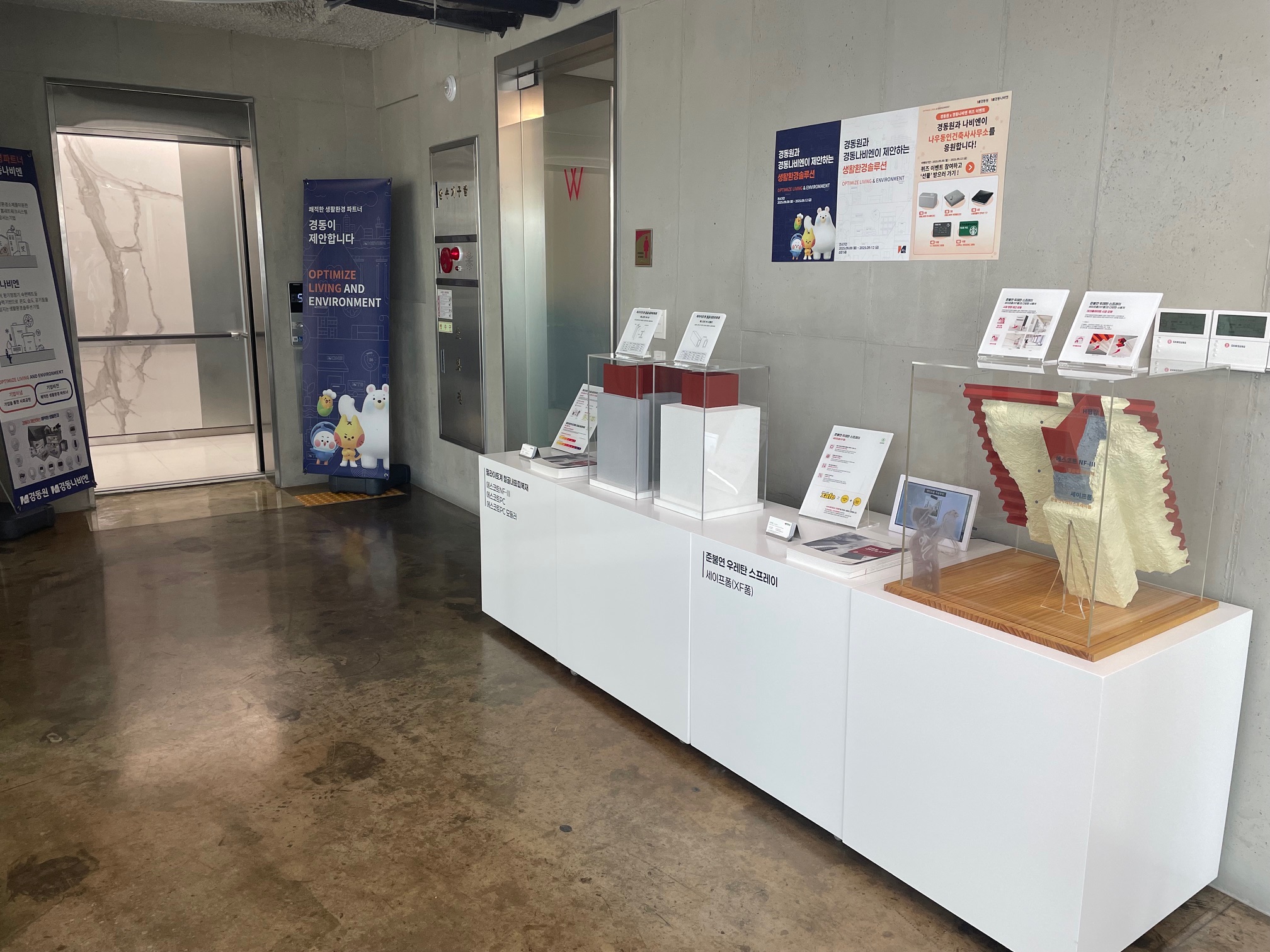 - 철골내화피복재인 에스코트, 화재에 안전한 우레탄 스프레이폼인 세이프폼, 심재 준불연 우레탄 단열재인 세이프보드, 심재 준불연 우레탄 샌드위치패널인 세이프패널 실물 모듈 전시